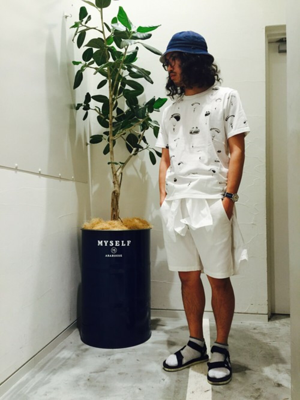 前回はオールネイビーコーデでしたが、今回はオールホワイトコーデです。 個人的には、暑くなってくると重ね着ができなくなってくるので、色味でおしゃれっぽく見せたくなります。 世間では大分浸透してきた、ワントーンコーデですが、オールホワイトには抵抗がある方多いのではないのでしょうか。 そういう方には、トップスに白地ベースの柄物(今回はパラシュートモチーフ)をチョイスする事をお勧めします。 腰巻のシャツも白で纏めると更に素敵です。