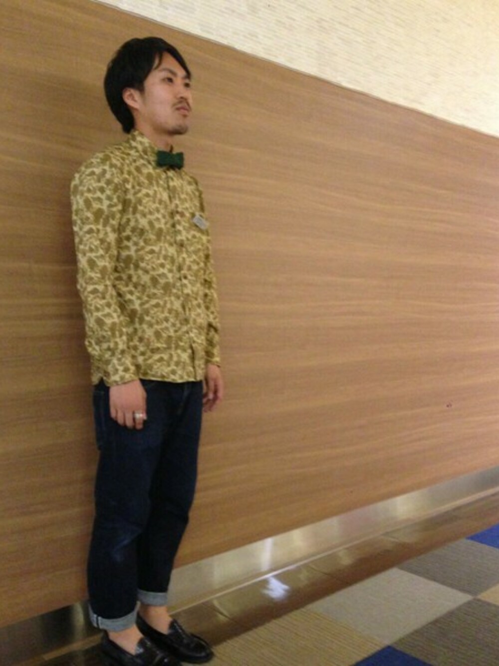 カモ柄のシャツを着用する時はとことん外すのがオススメです。デニムにコインローファー、カモ柄シャツにボウタイ。これぞ、外しの結晶。そんなスタイルを体現しました。