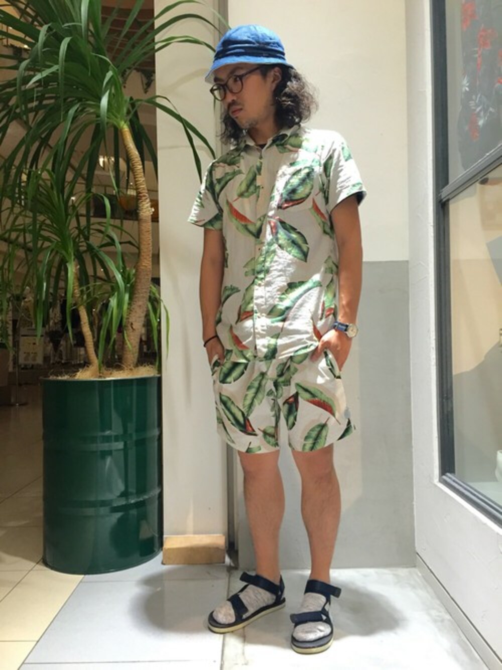 人気ブランドのDEUS、リーフ柄のセットアップをコーディネイト。 ショーツは水陸両用にてご利用頂ける優れものです。 足元はトレンドど真ん中のTEVA風サンダル&木目調ソックスでまとめてみました。