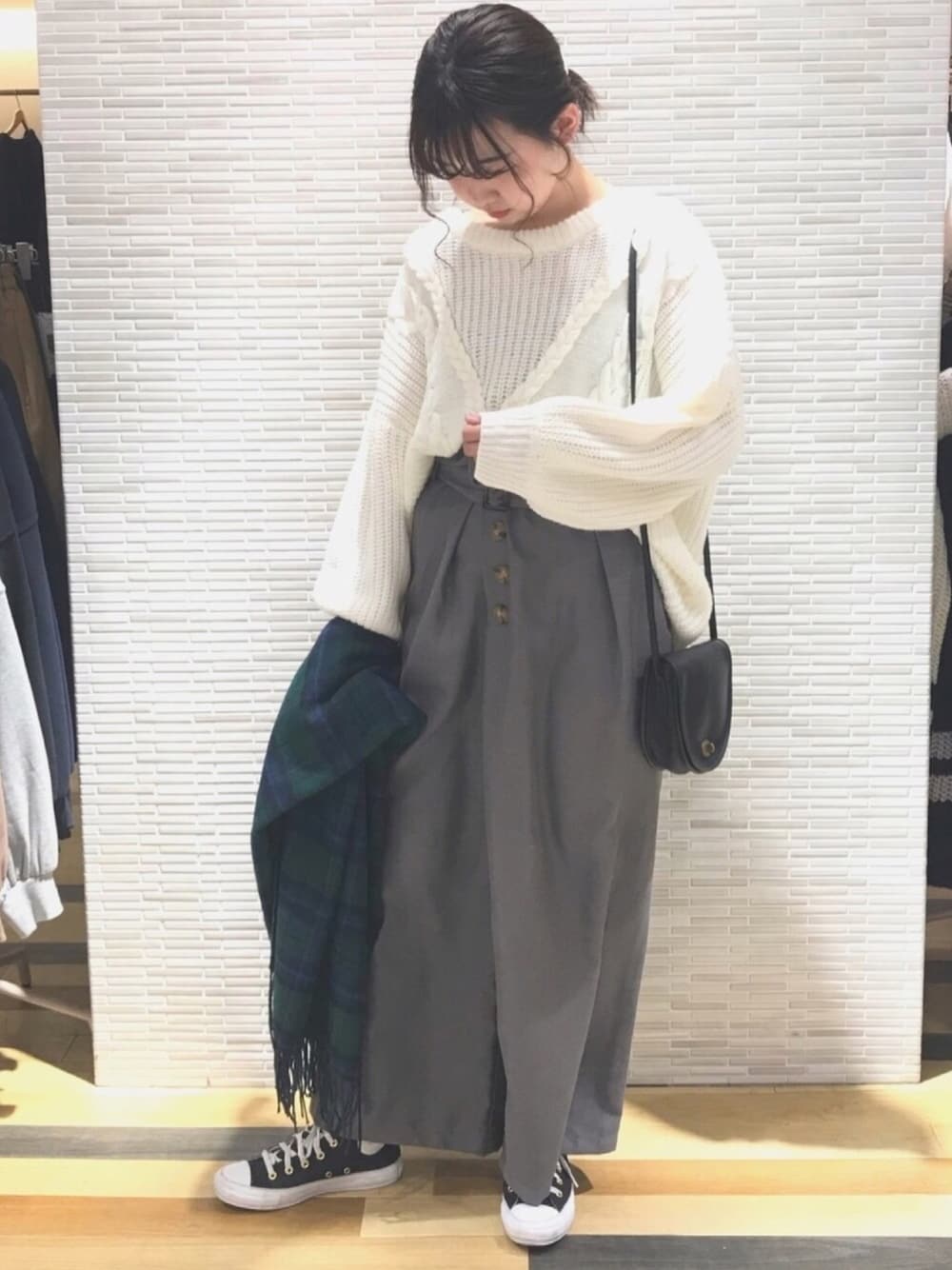 トップス*5389円 パンツ*5389円 ストール*3229円 シンプルにグレーのワイドパンツに白のケーブルニットを合わせてみました✨ 結構ゆったりなワイドパンツですが、タックが入ってるのでスッキリ見えます😊 ニットも長めの丈なのでチュニックとしても着れます😉