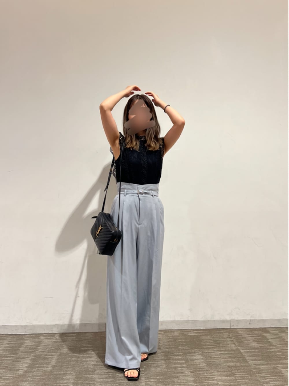 きちんと見えて、どこか柔らかい。 そんな綺麗めスタイルを、自分のペースで楽しんでいます。 黒のレースノースリーブに、アイスブルーのハイウエストパンツを合わせて すっきり感と女性らしさを両立𓍯 サンローランのルルでほんのりモード感を足して、”頑張りすぎない余裕のあるきれいめ”に仕上げました🖤 #キレイめカジュアル #夏コーデ #サンローラン #アイスブルー #大人コーデ #erena_style