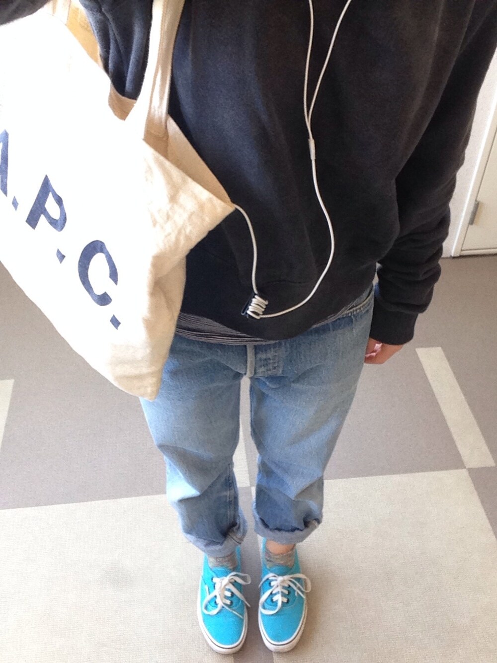 5/11 スウェット着て行ったはいいものの 暑すぎて無印でTシャツ買った日。 VANSとデニムは古着。