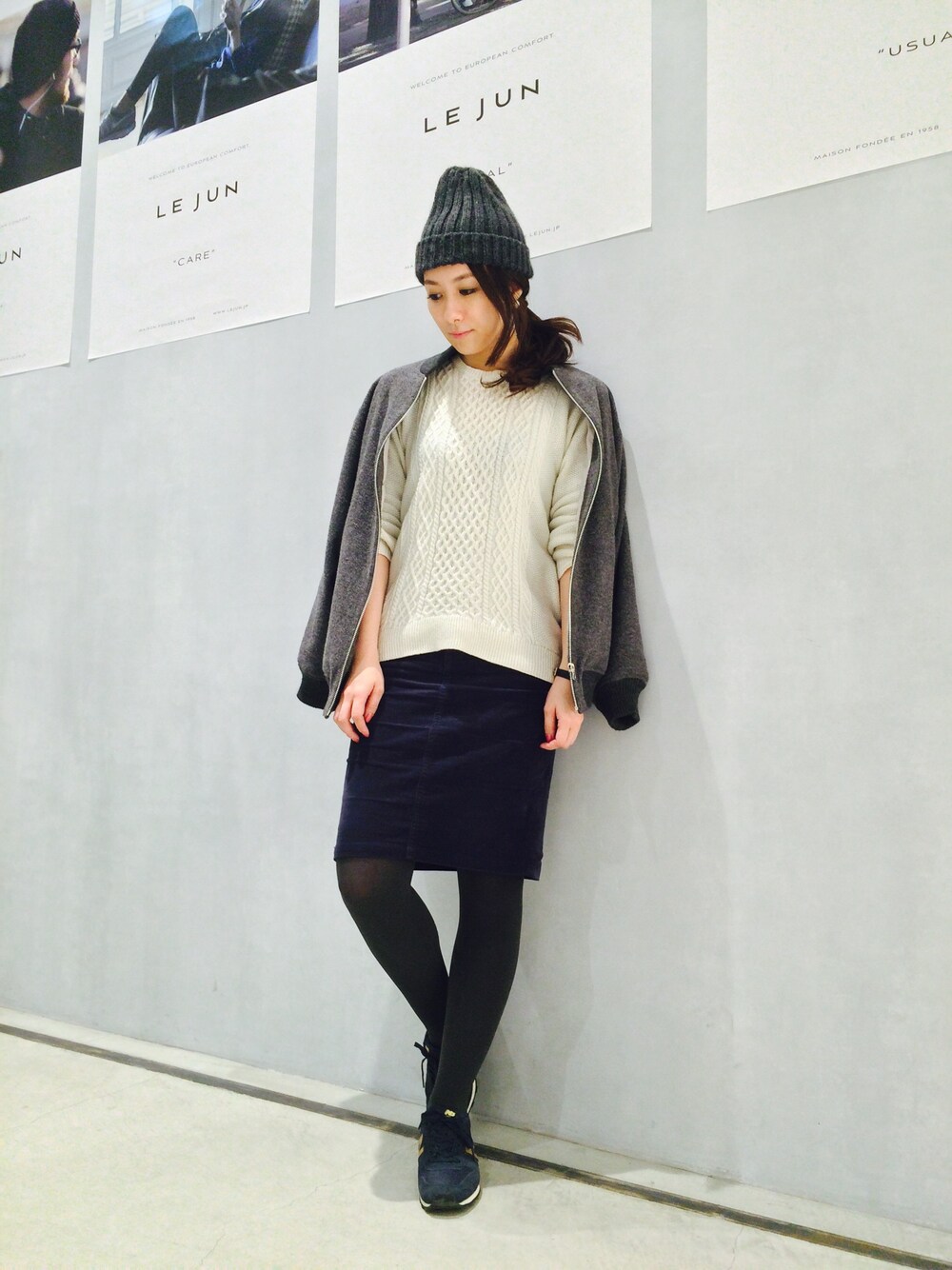 大人なタイトスカートをニット帽、スニーカーでカジュアルダウンしました! ビッグシルエットのスタジャンで今年らしく♪