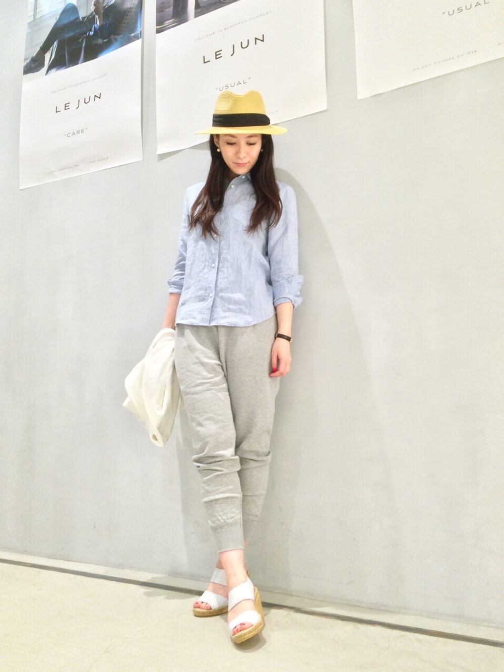 リネンシャツにスウェットパンツを合わせたリラックスコーデ。 カルザノールのサンダルで女性らしく。 夏まで使えるリネンシャツ、オススメです!