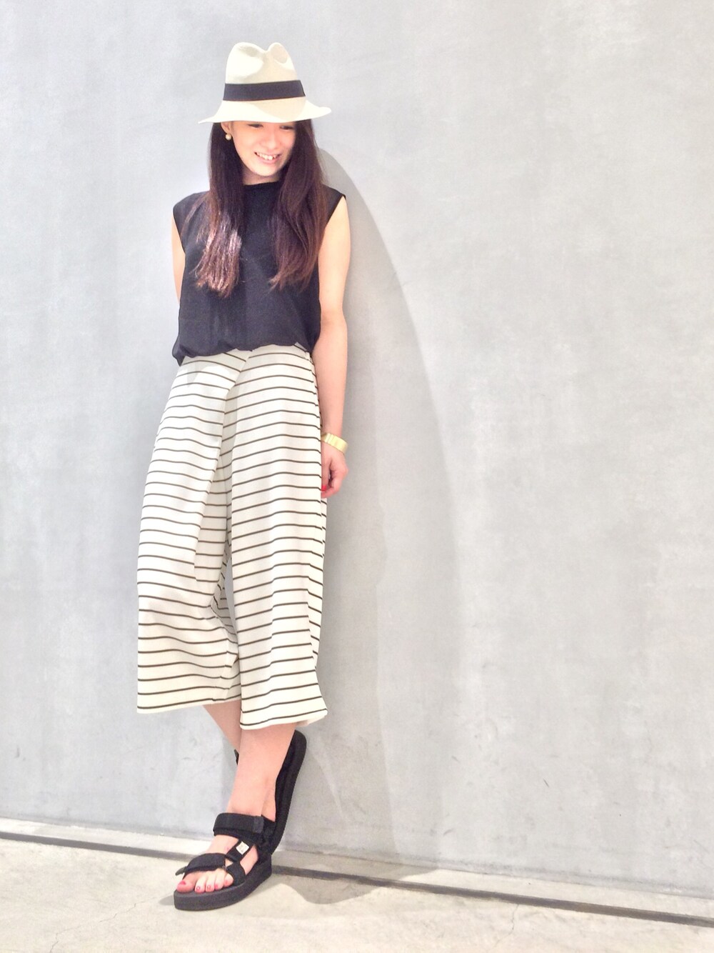 新作のガウチョパンツを大人カジュアルに! スポサンでリラックス感を出しました! ボーダーのガウチョ珍しくてオススメです。