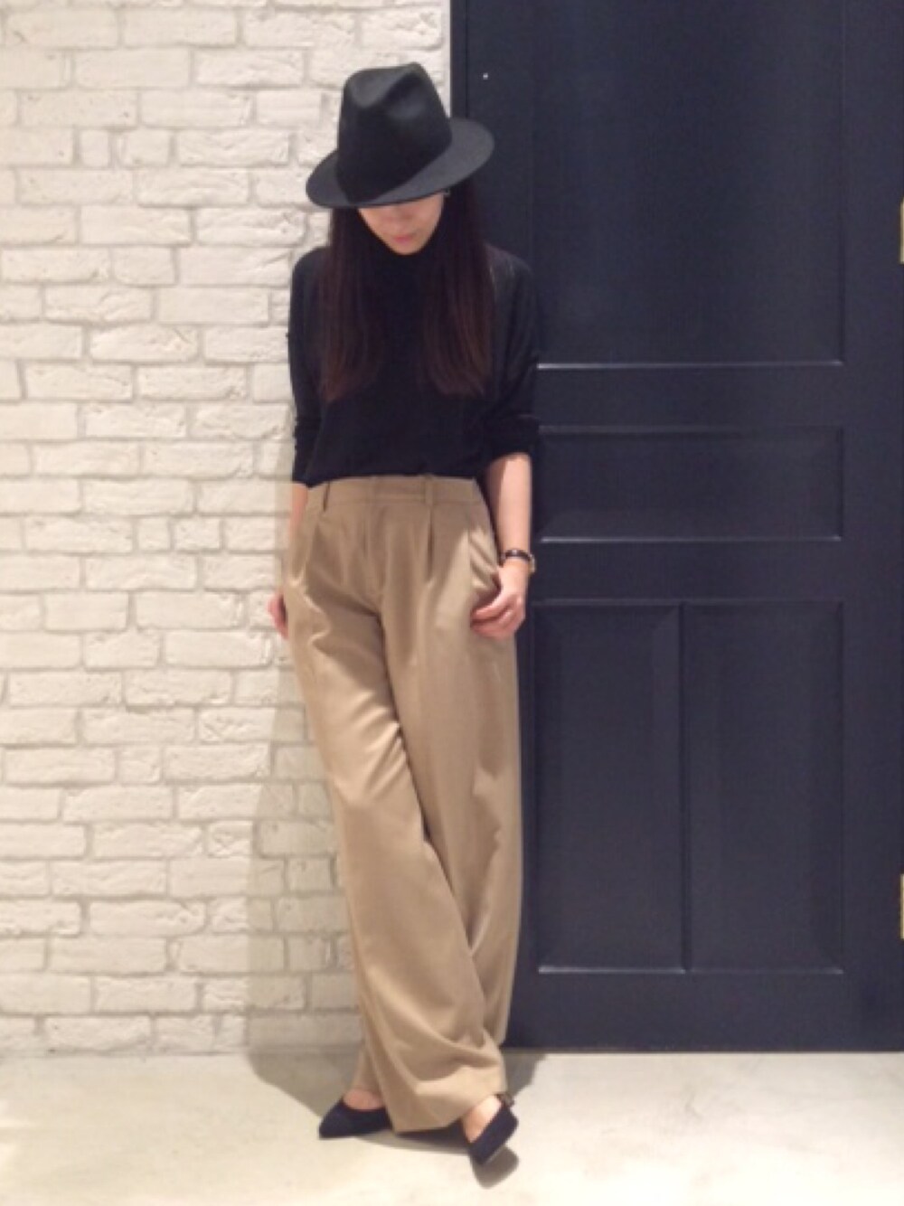 ワイドパンツが主役のシンプルコーデ。 ベージュパンツの存在感がポイントです。