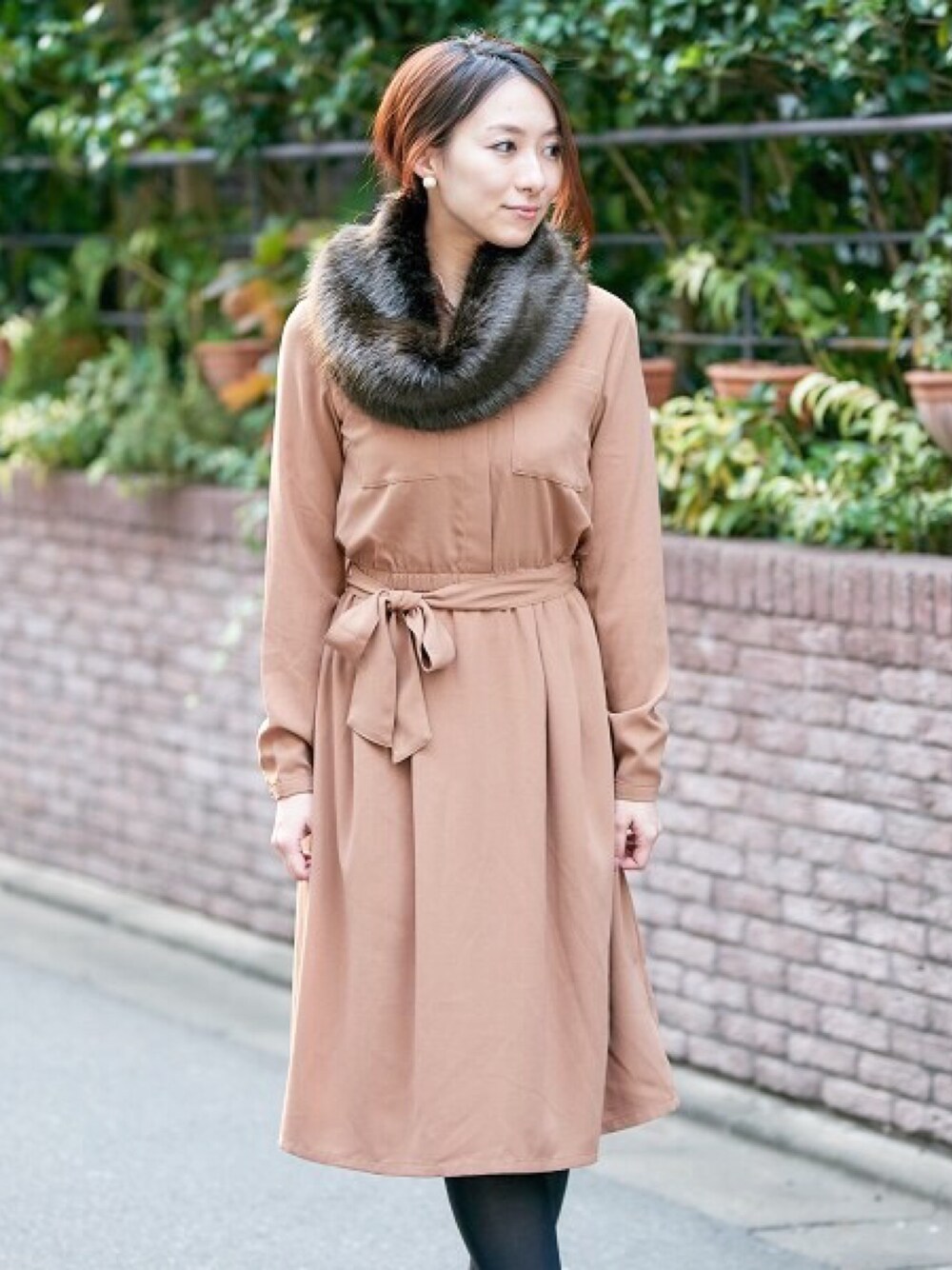 色んなシーンで使えるキレイめワンピ。 ファーで女性らしさをプラスしました。