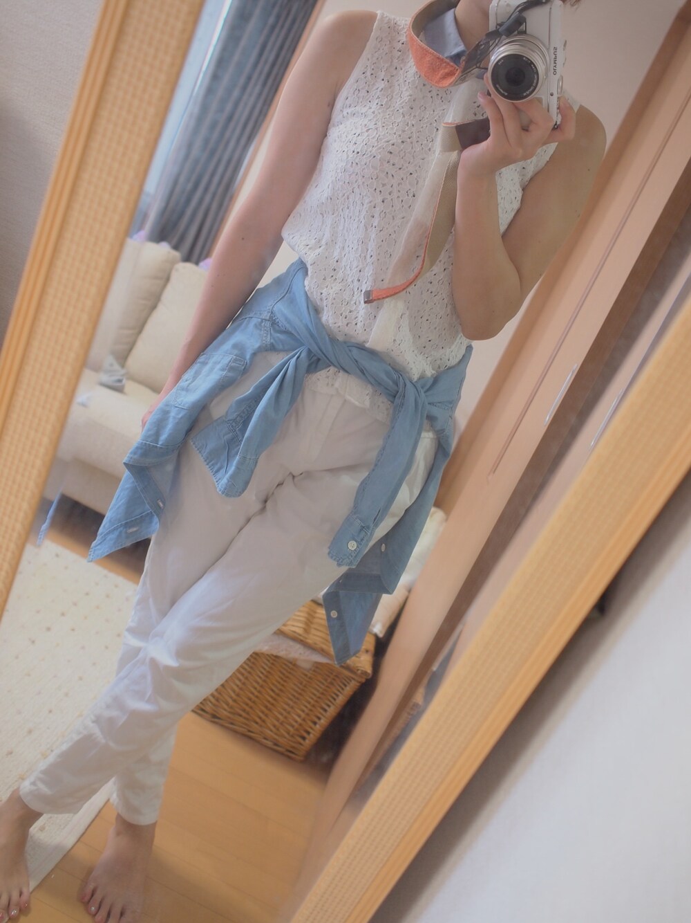 白×白コーデ。 昔は抵抗あったけど、流行ってると、やりたくなるよね笑 でも、さすがに真っ白じゃ爽やかすぎるので腰に青を取り入れて〜笑