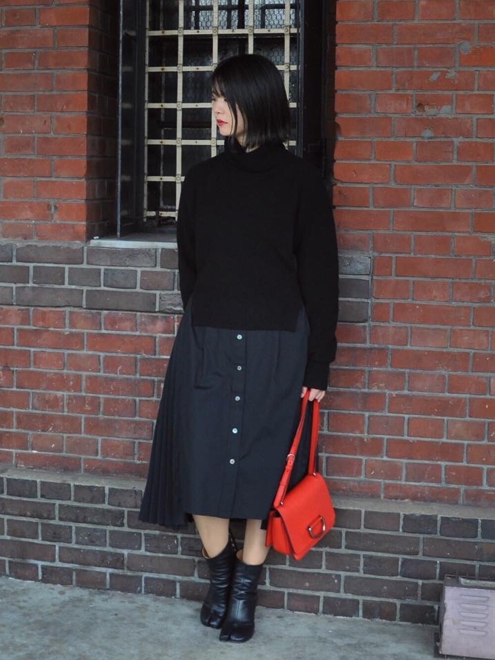 横浜おさんぽ🐾 Sacaiのワンピース、ニットとプリーツが 組み合わさっていて一枚で様になる🖤 後ろもとっても可愛い❣️ グログランテープで絞れるところも🙆♀️💕 《brand》 dress : Sacai boots : Maison Margiela bag : BURBERRY