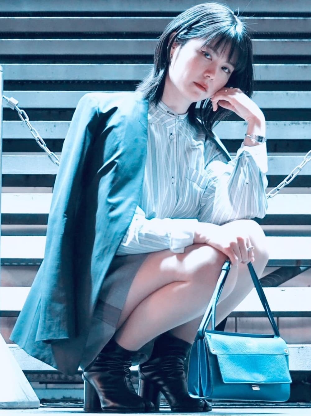night shooting🌙 gray × blue outfit🐺💙🤍 《brand》 jacket : DES PRÉS(TOMORROWLAND) shirt : TOMORROWLAND pants : sacai boots : Maison Margiela bag : FURLA