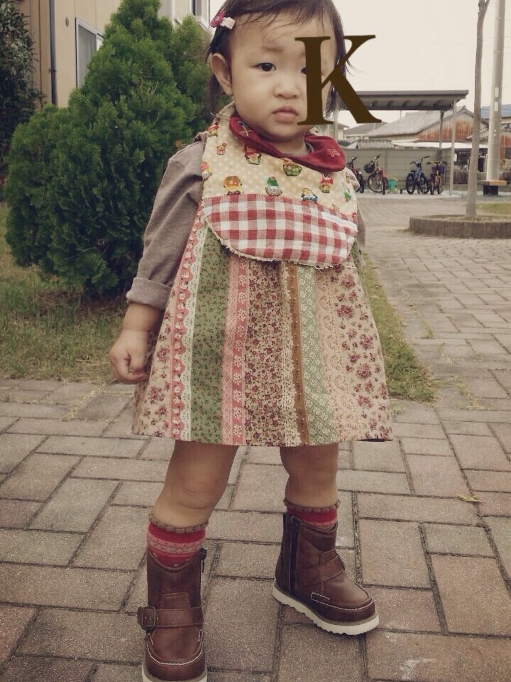ブラウン系のワンピースを着用したキッズの秋コーディネートの1枚目の写真
