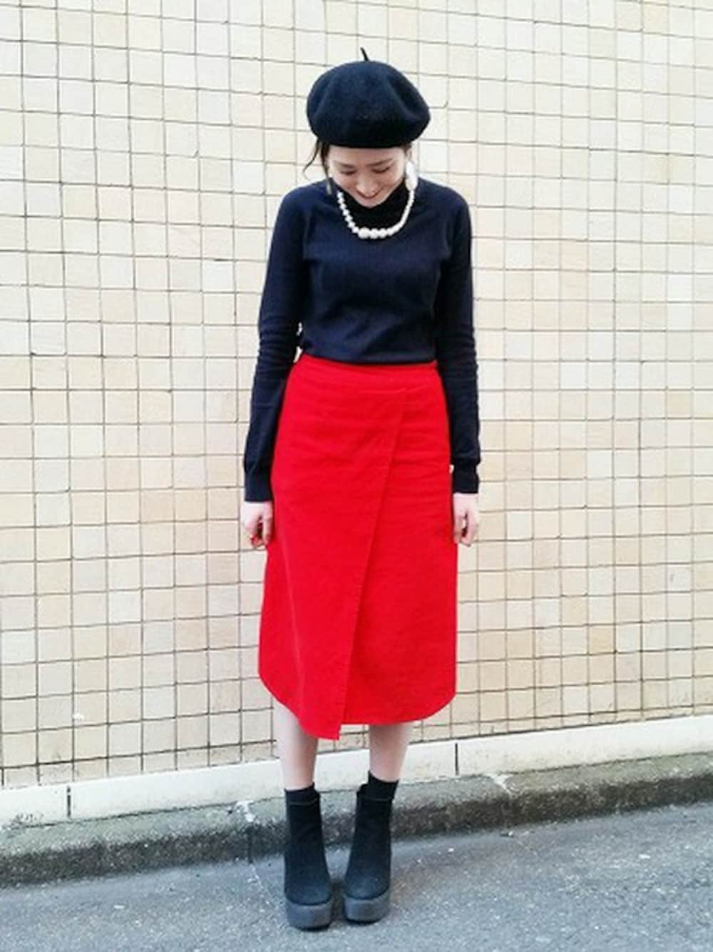 色鮮やかな赤のスカートが主役のコーディネート。 他のアイテムは黒でまとめ、さらにウエストインしてきれいめ縦シルエットに挑戦してみました★