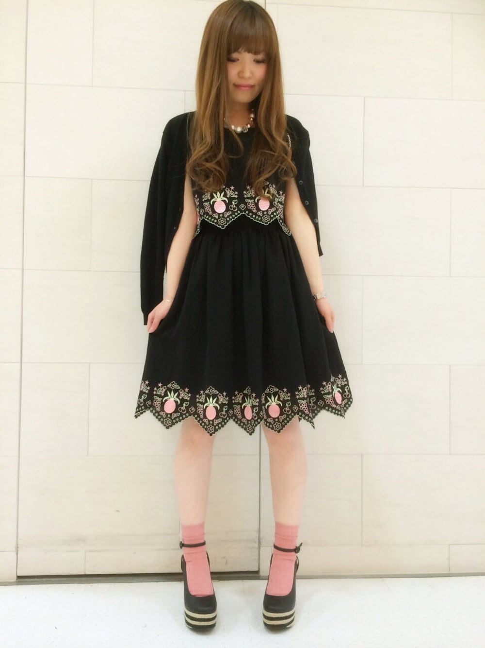 珍しく全身黒コーデ♡ ピンクのパイナップルが目立って可愛い♡