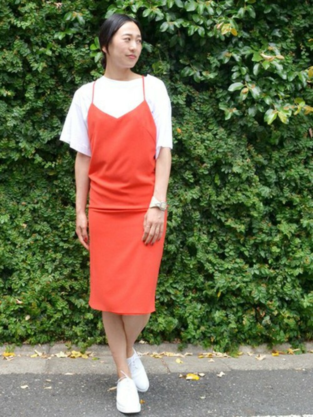 発売とともにすっごい人気をいただいている、キャミワンピース。 セクシーにも着られるアイテムですが、あえてTシャツにコーディネートしました。 スニーカーに合わせたりしてコーディネートが広がるアイテム。 完売前にぜひチェックしてくださいね!