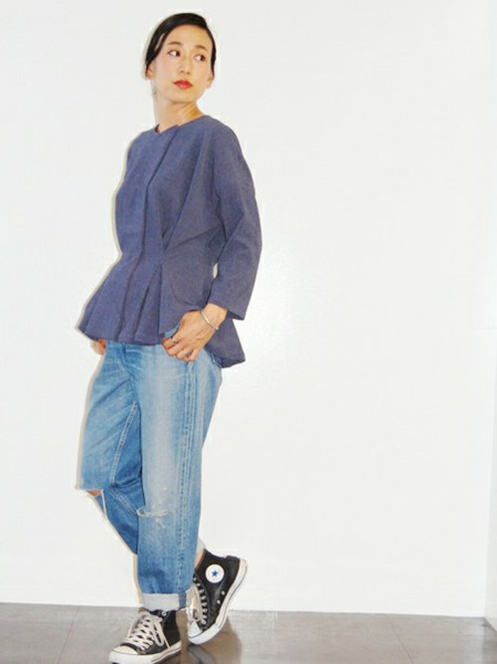 最近はKONAデニムを大き目ではくのがお気に入り。 きれい目のトップスにあえて、ダメージのあるデニムを合わせて スニーカーを合わせる気合の入りすぎてないコーデ! トップスは昨日から予約販売スタートした新作アイテムです。