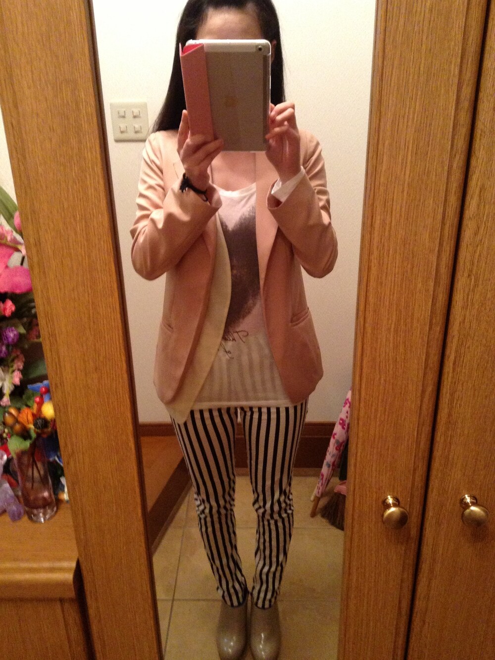 ジャケット:ISBIT×千紗(girl next door) Tシャツ:OZOC パンツ:JEANASIS ブーティー:JEANASIS 去年の夏に購入したJEANASISの ストライプパンツはかなりお気に入り💖