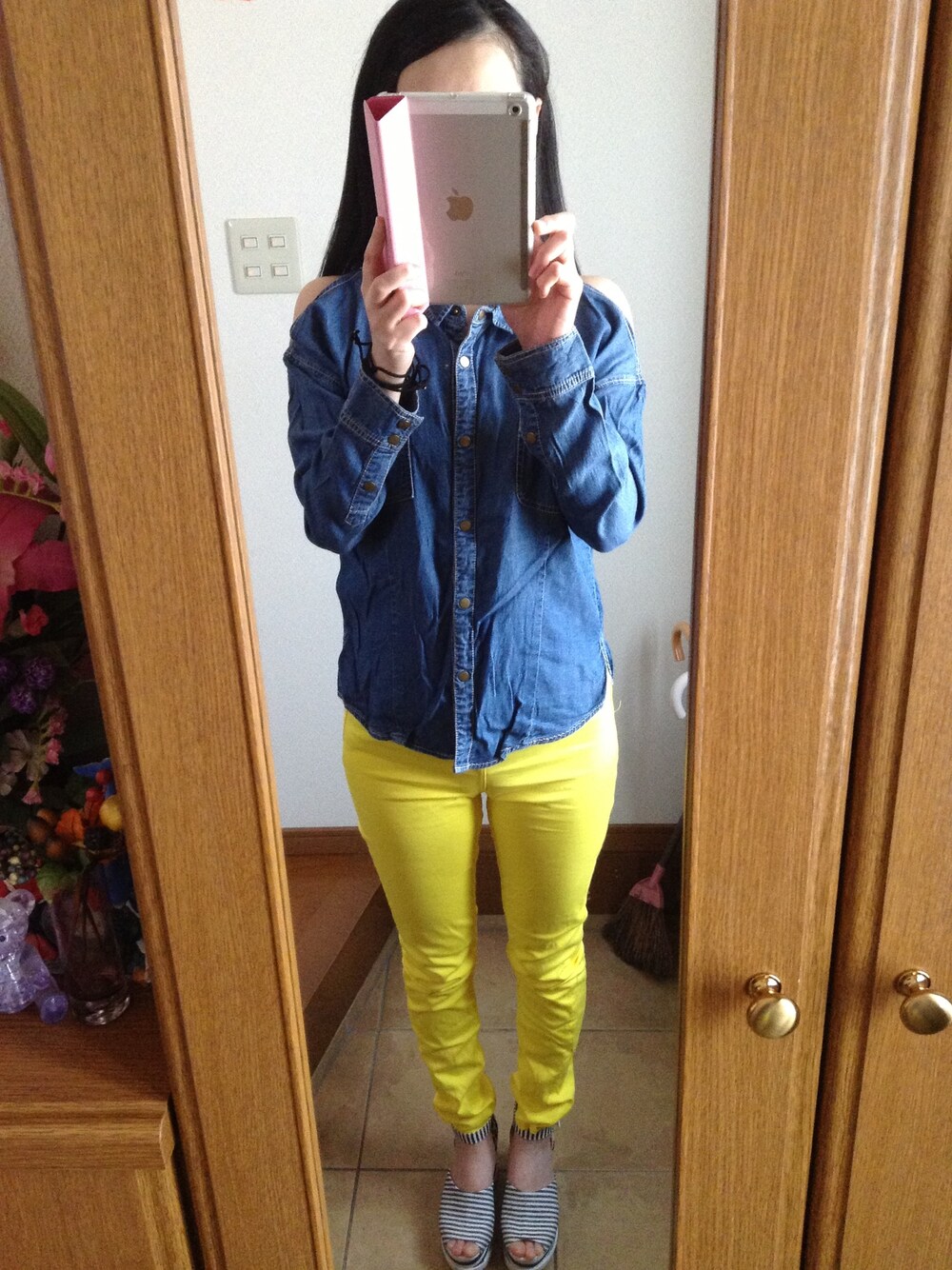 デニムシャツ:MURUA キャミタンク:JEANASIS カラーパンツ:JEANASIS サンダル:JEANASIS