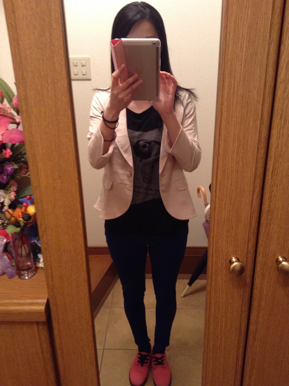 ジャケット:INGNI Tシャツ:MURUA パンツ:ANAP スニーカー:Dr.Martens 暗いのとアングルが悪いので分かりにくい ですが、、、このパンツ、前がブルー 後ろがブラックのバイカラーになってます!