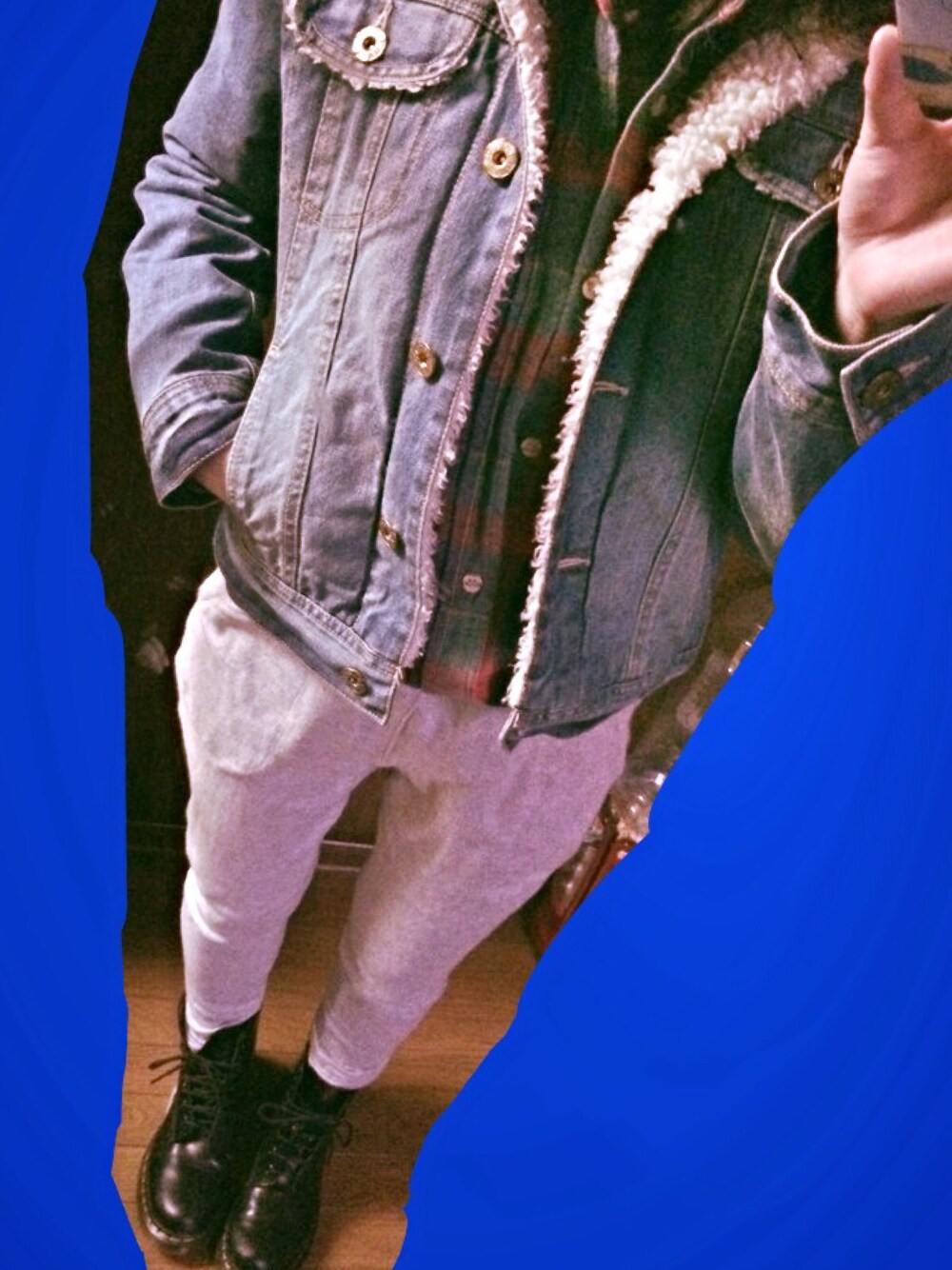 寒いのでボアつきGジャンT_T チェックシャツ 古着 トップス coen スウェットパンツ UNIQLO ジャケット LOWRYS FARM ブーツ Dr.Martens
