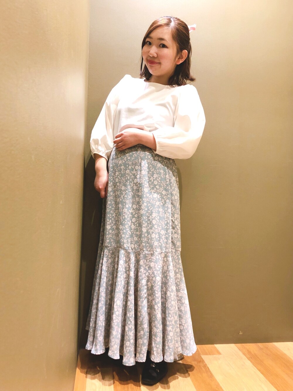 こんにちは🌸 いつもご覧いただき ありがとうございます💗 花柄スカートは切替になってるので 動きがあるとスカートがふわっと広がりシルエットが綺麗です🌟 トレンドのボリュームスリーブのトップスと合わせてガーリーコーデにしました💗