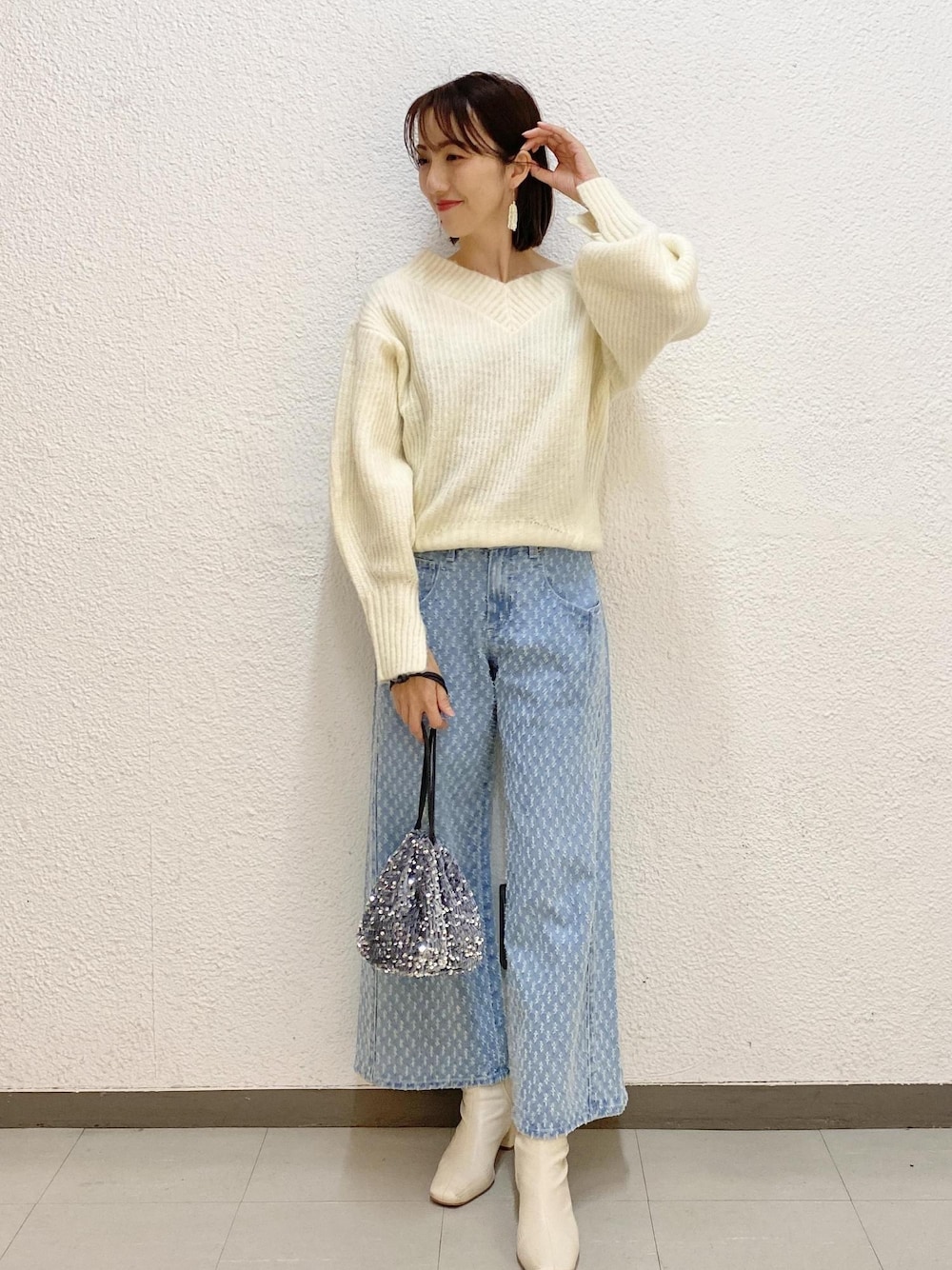 春まで着られるVネックニットです! 深めのVネックで大人っぽく着られるふわふわニット♪ カジュアルなスタイリングなので小物で大人っぽさをプラスしました!