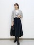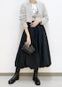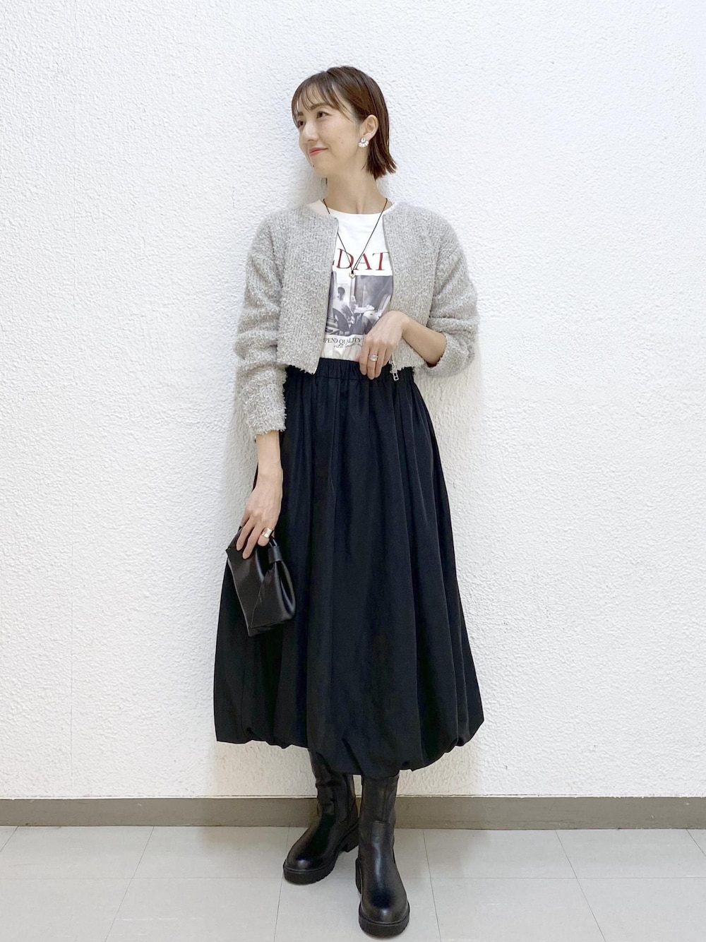 大人気ののリボンヤーンジップカーディガンを使ったスタイリングです⭐︎ ジップカーディガンが可愛らしい生地感なので、他はブラックでシックに統一して、大人モノトーンスタイルにしました。 チラ見えするロゴTが抜け感をプラスしてくれます!!
