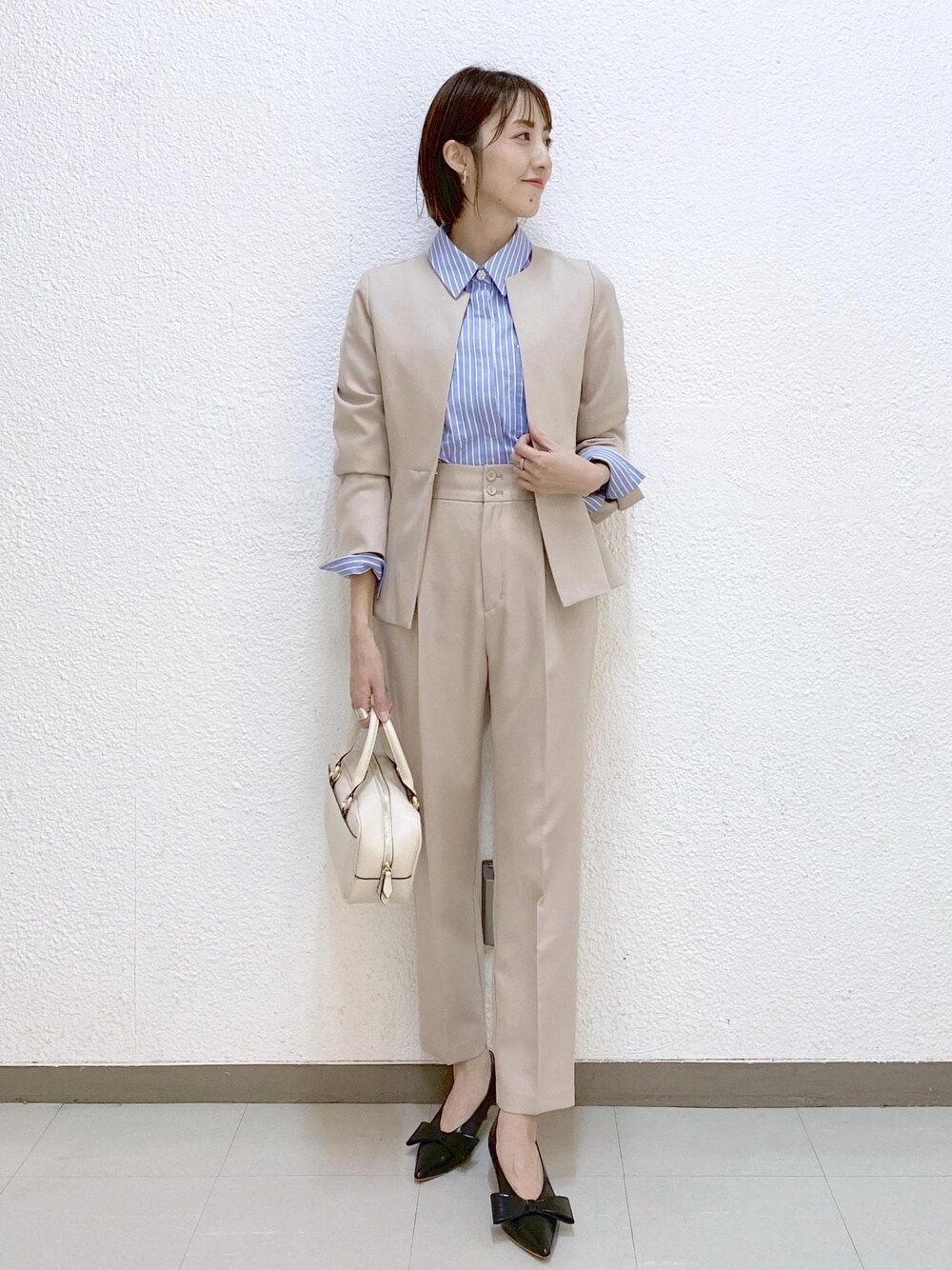 春のセレモニースタイルです。 中のシャツをストライプにしたので、セレモニーだけでなく通勤やお仕事着としても◎ ジャケットはセットアップで着ると、よりきちんと感が出せるので一つは持っておきたいアイテム⭐︎