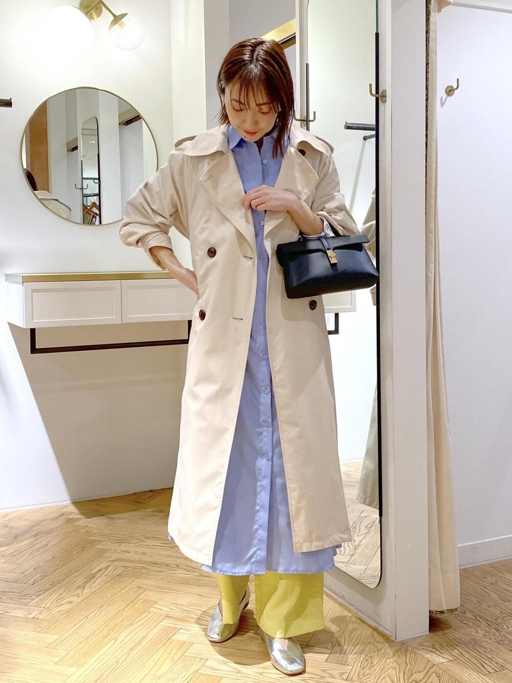 お花見に着て行きたい春カラーのスタイリングです⭐︎ バッグを黒で締め色にしました! 朝晩は少し冷えるので、軽めのトレンチコートが重宝します!