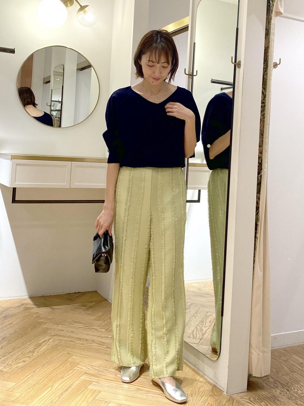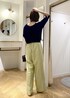 ネイビー×グリーンの大人カジュアルスタイル⭐︎ シンプルなニットにはフリンジパンツを合わせるとこなれ感が出てオススメ!!