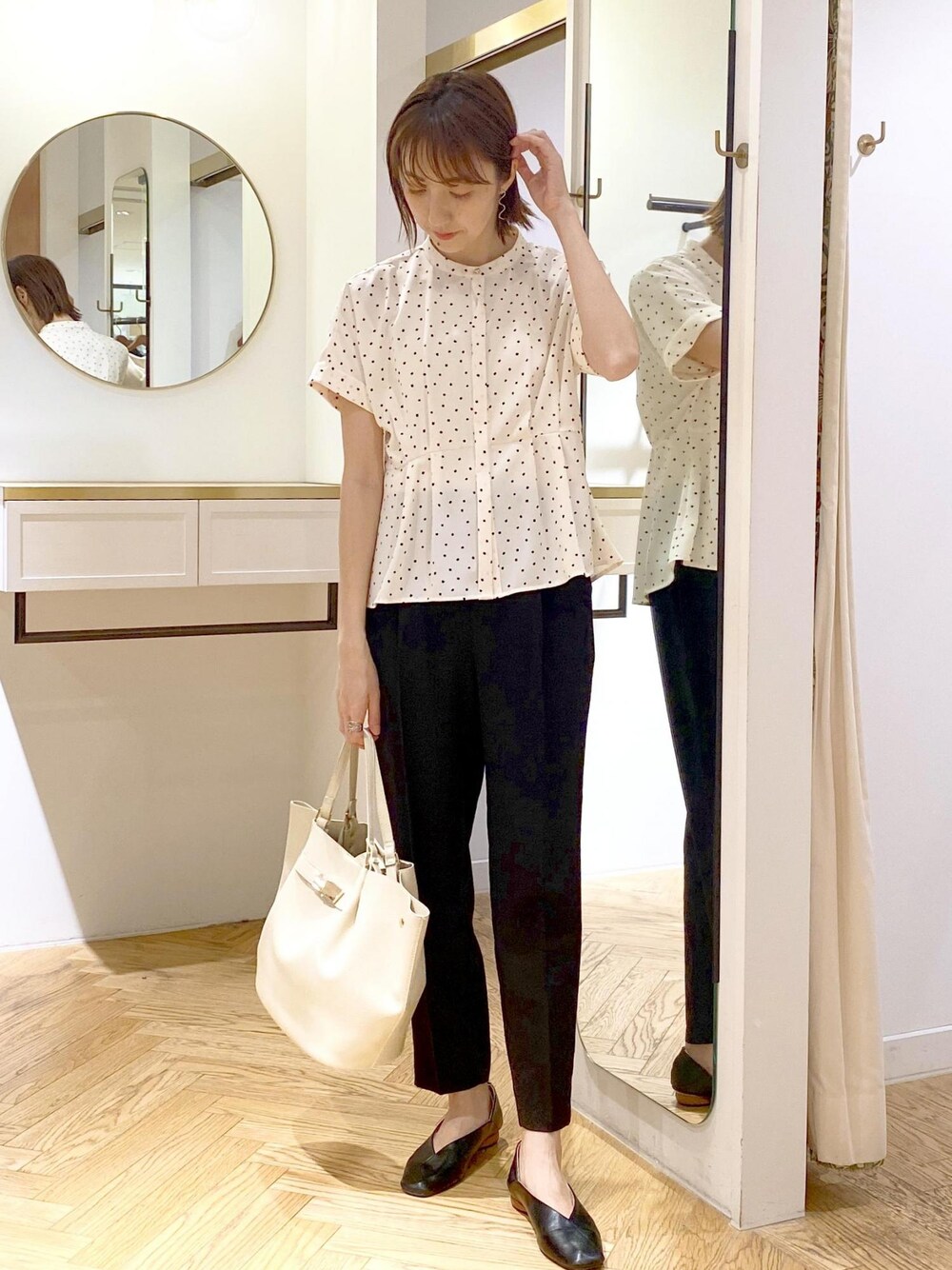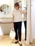 サラッと着心地の良いタックブラウスです! ベーシックなテーパードパンツと合わせて、オフィスのモノトーンコーデにしました⭐︎
