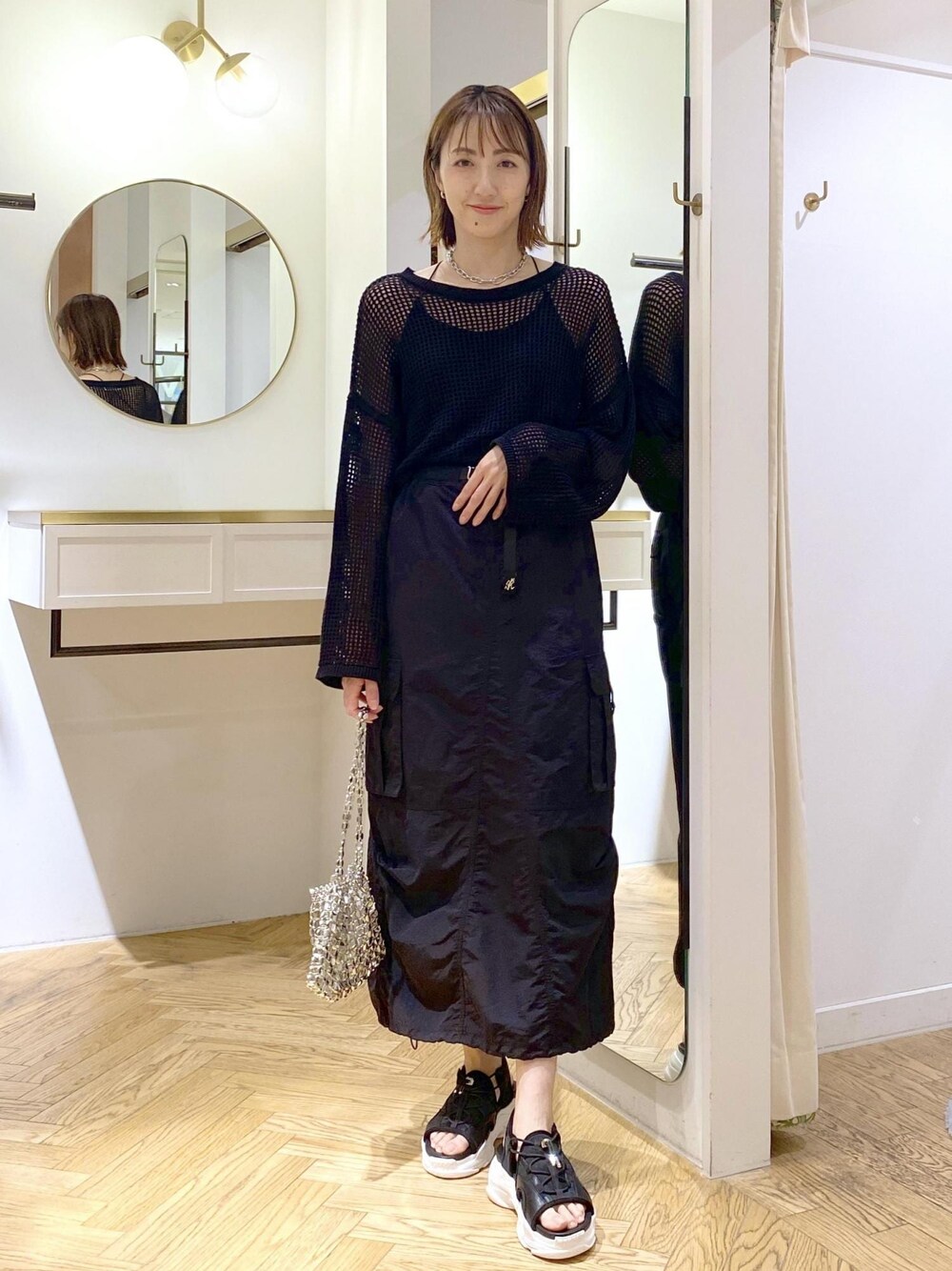 ブラックのメッシュニットでワントーンコーデにしました! グラミチのスカートと合わせればBBQなどの屋外イベントにもピッタリ⭐︎