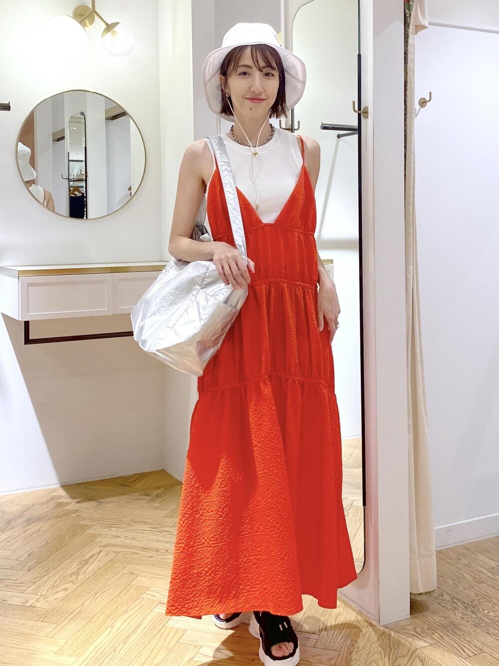 キャミワンピースが主役のスタイリングです♪ つば広ハットと大きめバッグで旅行や屋外イベントにもピッタリ!!