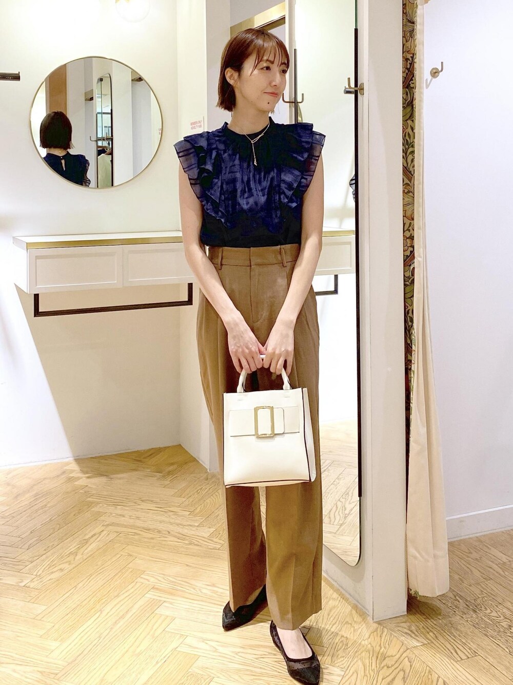 大人気美easyシリーズの新色入荷しました♪ ネイビー×ブラウンで大人シンプルにコーディネートしました! 通勤にもオススメなスタイリングです!