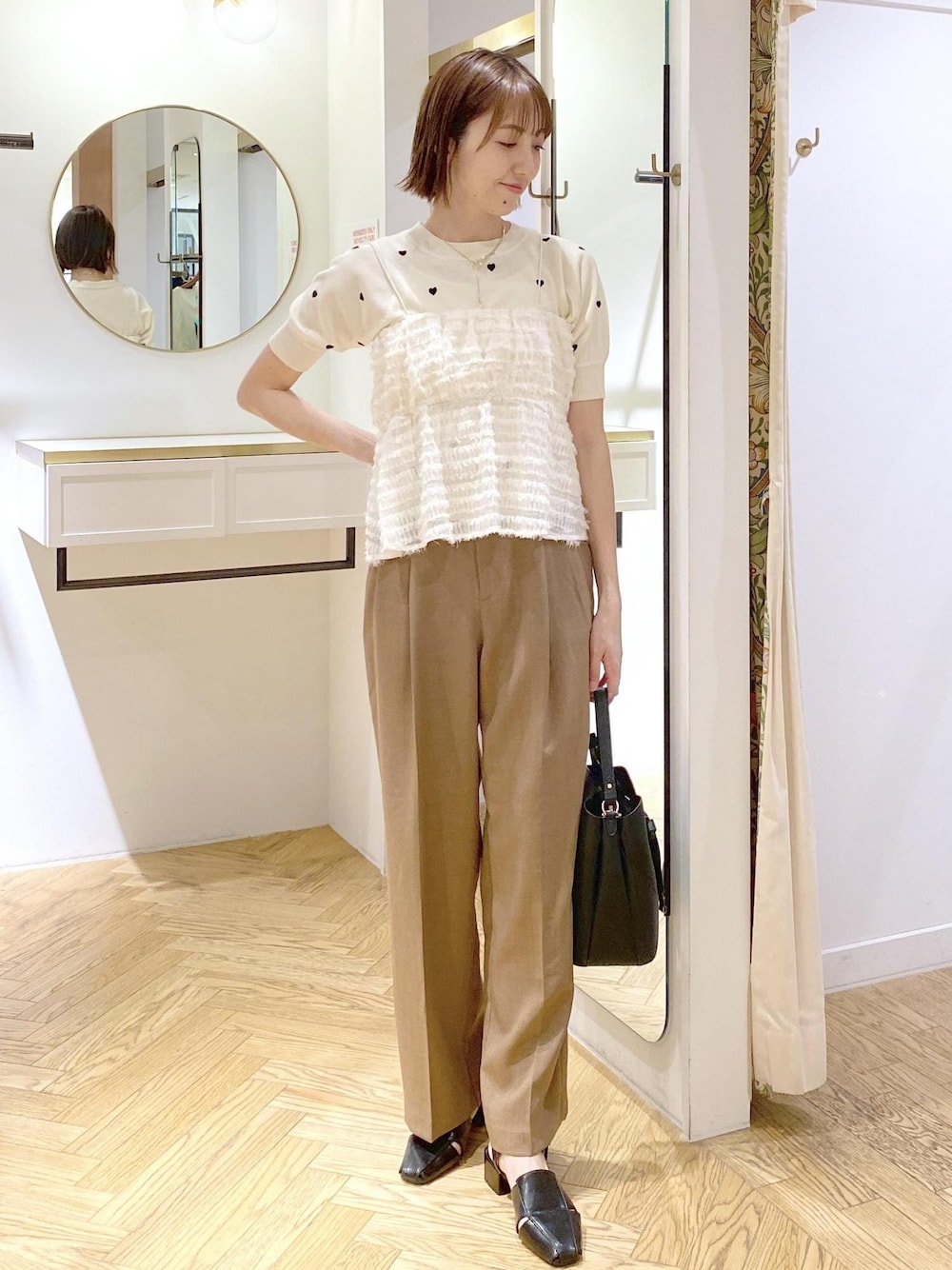 フリンジビスチェをハートニットに重ねたレイヤードスタイルです! ビスチェのショルダー部分が細いので、ニットに重ねてもゴワゴワせずに着やすかったです♪