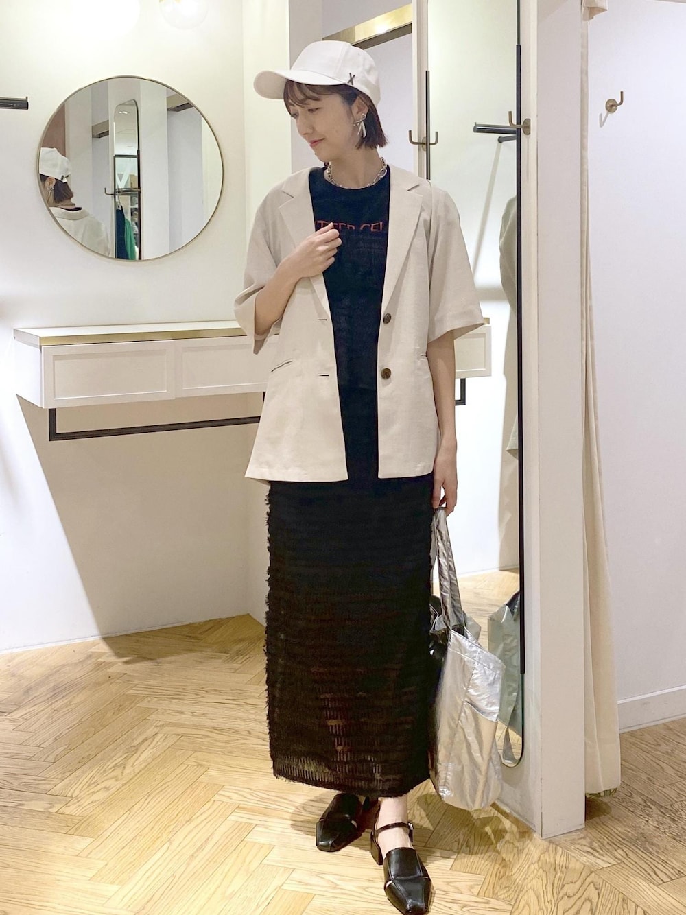 フリンジビスチェのセットアップにジャケットを合わせたレイヤードスタイルです! キャップや大きめバッグでカジュアルテイストを取り入れたのがポイント⭐︎