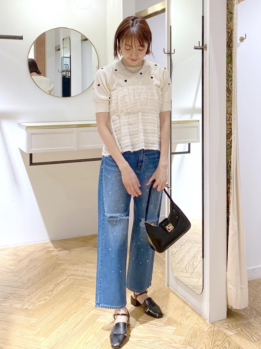 サラッとしたハートニットに今年らしいビスチェを重ねたレイヤードスタイルです! Tシャツではなく同系色の薄手のニットと重なるとカジュアルになり過ぎないので、大人女子にもオススメです⭐︎