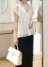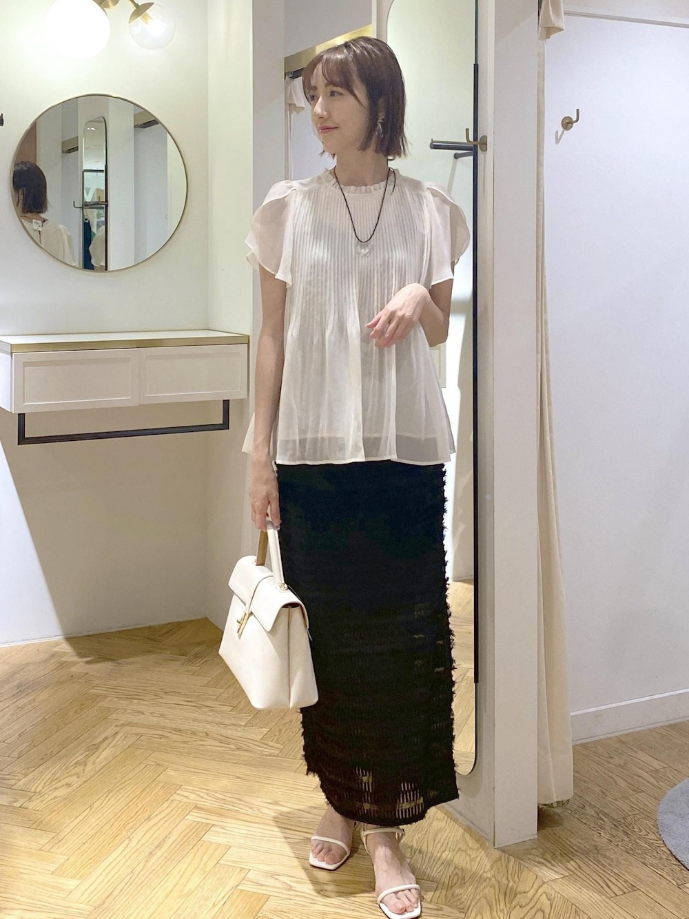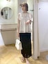 大人気のプリーツブラウスにフリンジスカートを合わせたモノトーンスタイルです♪ きちんと見えするブラウスですが、足元をサンダルにして抜け感を出したのがポイント⭐︎