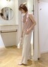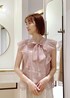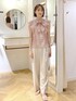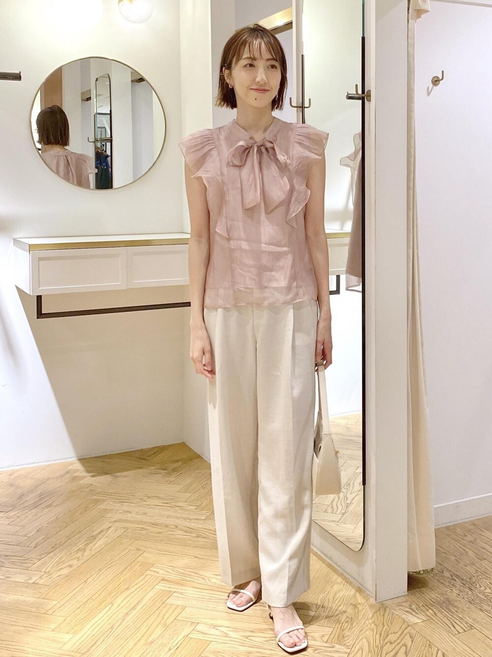 ピンク×オフホワイトの淡色コーディネートです⭐︎ シアーブラウスは敢えてパンツにインせずにサラッと着て柔らかい印象に♪ 女性らしく清潔感のあるカラーでオフィスシーンにもピッタリ!