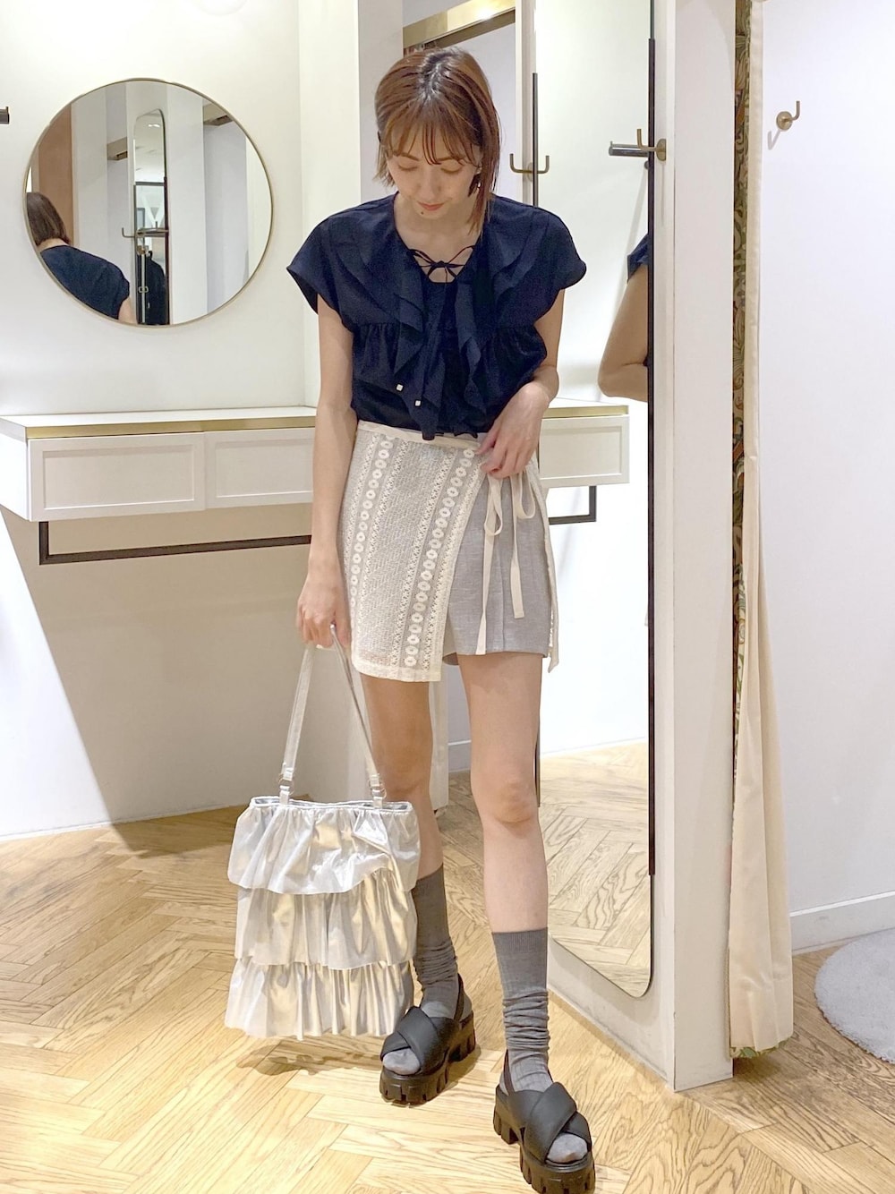 紐で結ぶタイプのレイヤードスカートを、ショートパンツに重ねたカジュアルスタイルです! 全体的にコンパクトなスタイリングにしたので、バッグはボリュームあるフリンジバッグにしました♪