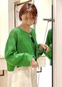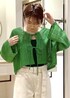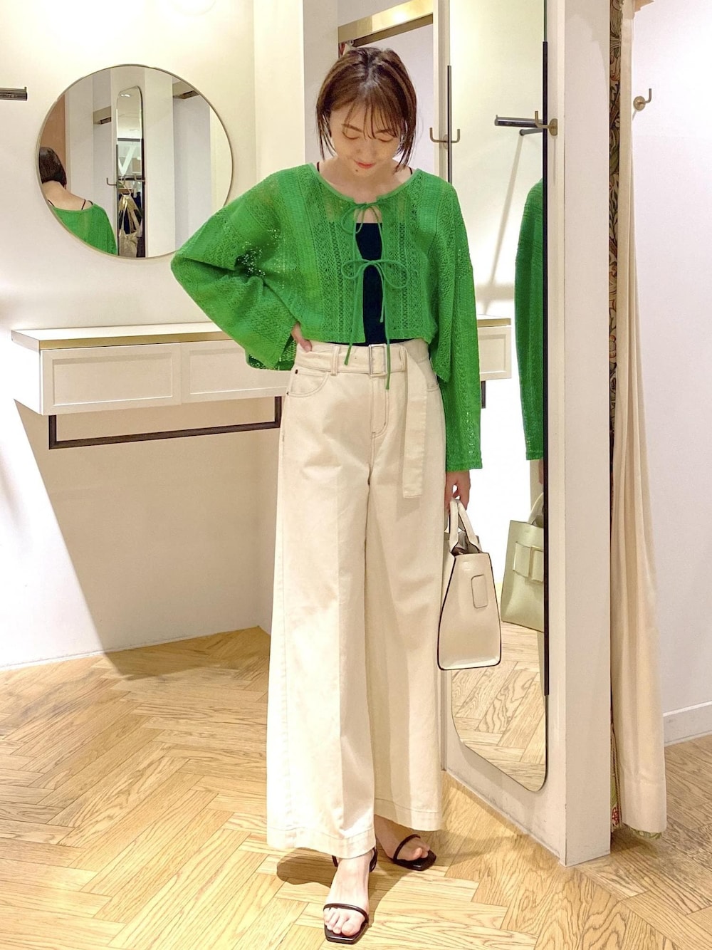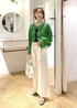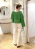 パッと目を引くグリーンに爽やかなホワイトデニムを合わせた大人カジュアルコーディネートです! ショート丈トップスにフレアデニムでメリハリ脚長効果も◎