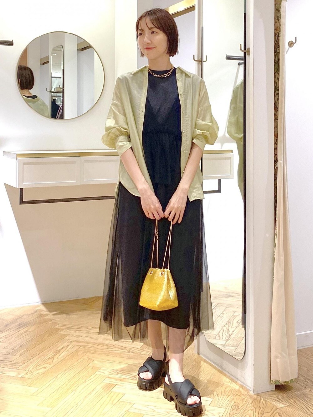 ノースリーブワンピースにカラーのシアーシャツを合わせたワンピーススタイルです⭐︎ ノースリーブワンピースには、長袖のシアーシャツがあれば紫外線対策や冷房対策にも安心◎
