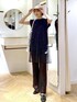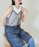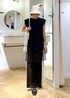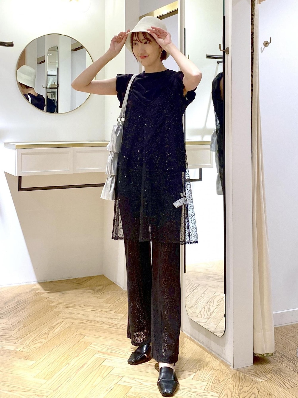 ブラックのスパンコールキャミが主役のブラックコーデです! ブラックのワントーンですが、スパンコールやレース素材で全体的に軽く見せたのがポイント⭐︎