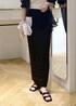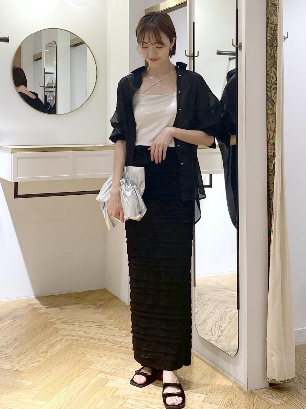 ブラックのシアーシャツを使った大人フェミニンスタイルです! シャツの程よい透け感と、小物のシルバーで女性らしさをプラスしました♪