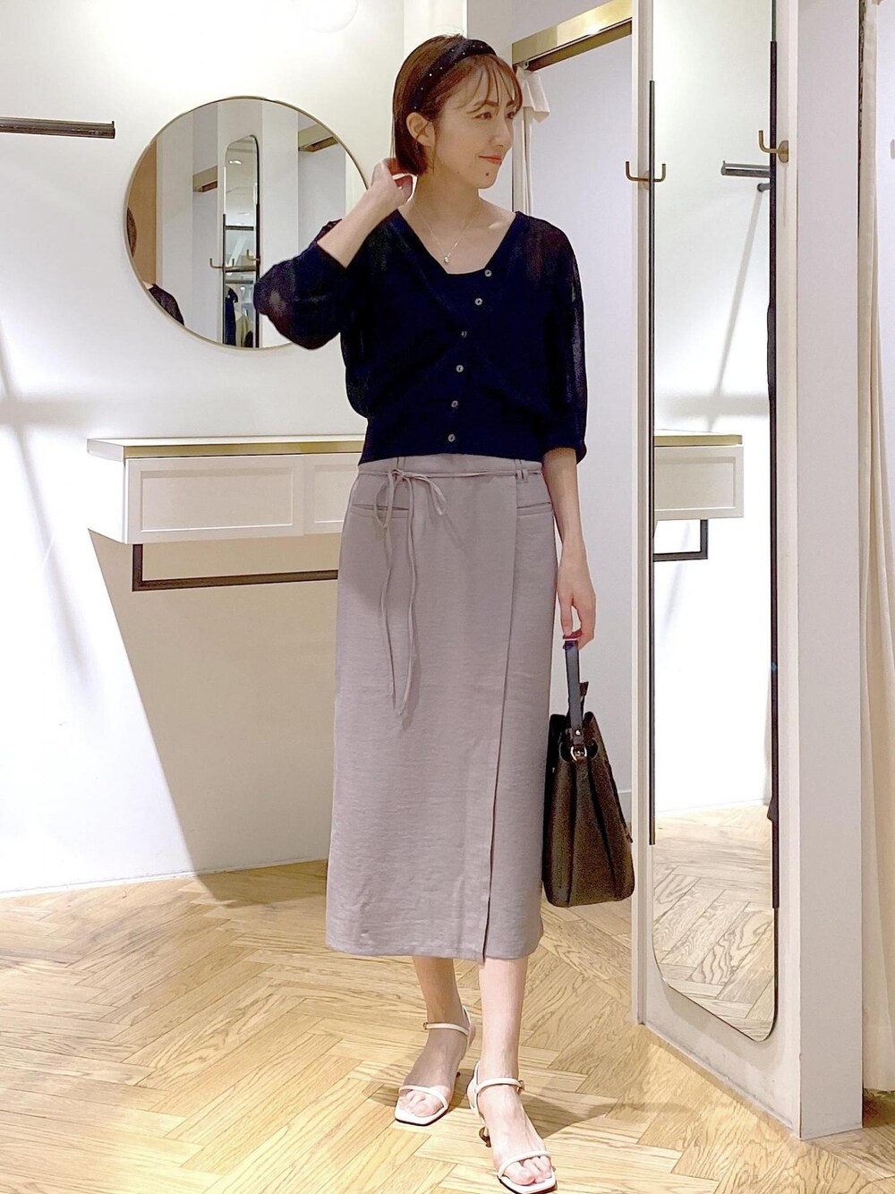ベーシックなスカートスタイルですが、ブラウスではなくシアーカーディガンを合わせればいつもと違った女性らしい印象に⭐︎ ジメジメする梅雨時期にもオススメのスタイリングです!