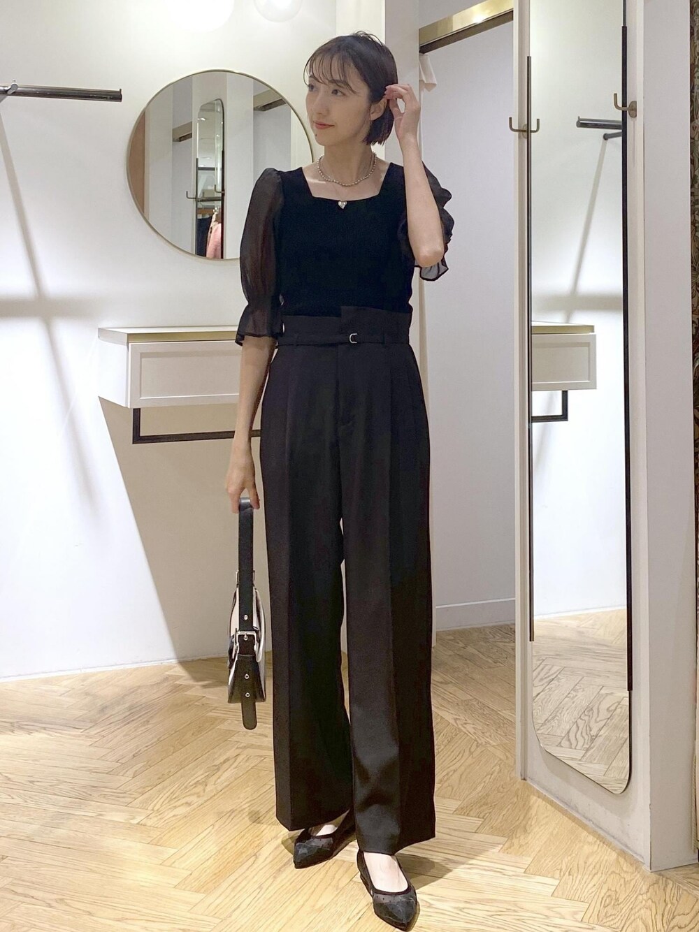 通勤にオススメなオールブラックコーデです!! 袖やパンプスに透け感があるので、重くなり過ぎず女性らしく見えるようにスタイリングしました⭐︎