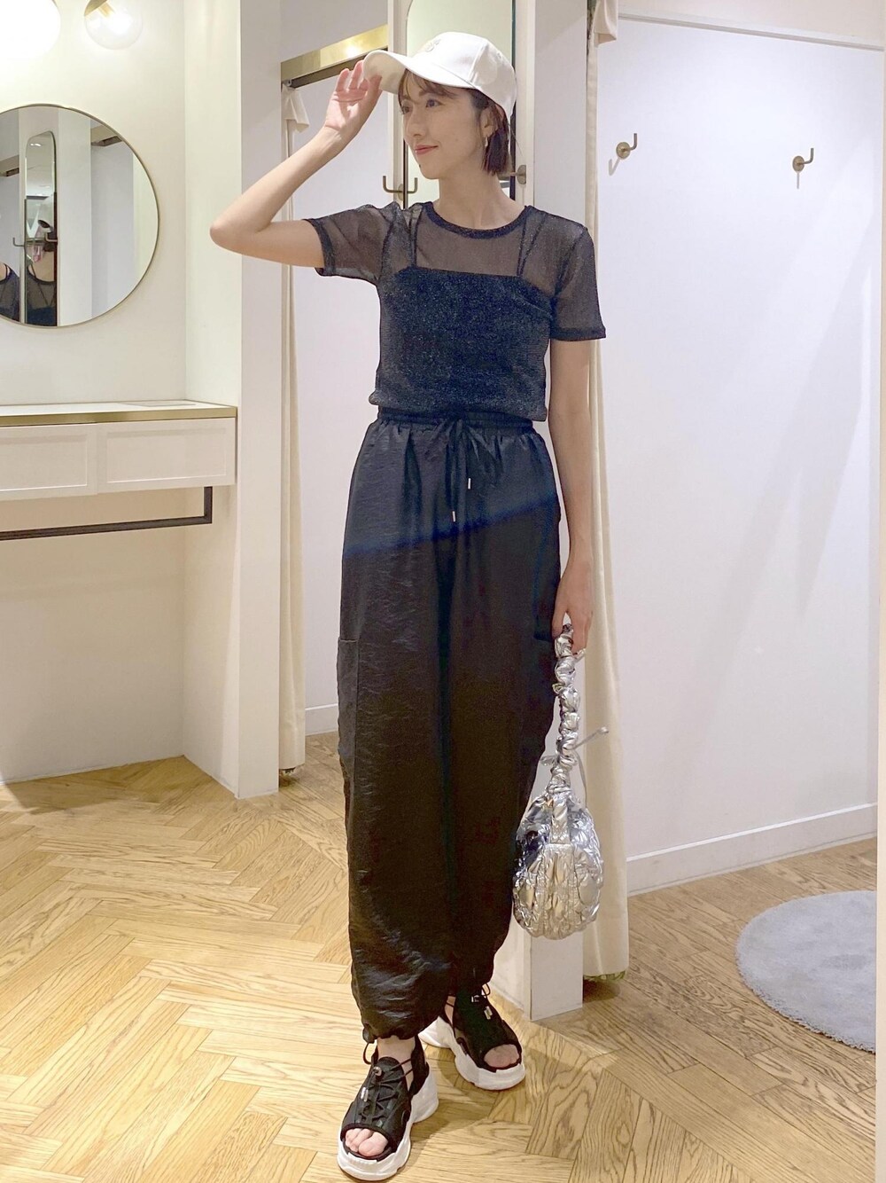 女性らしいシアートップスをスポーティなスタイリングにアップデート! 夏に向けて屋外でのイベントなどにもオススメなスタイリングです!