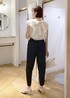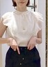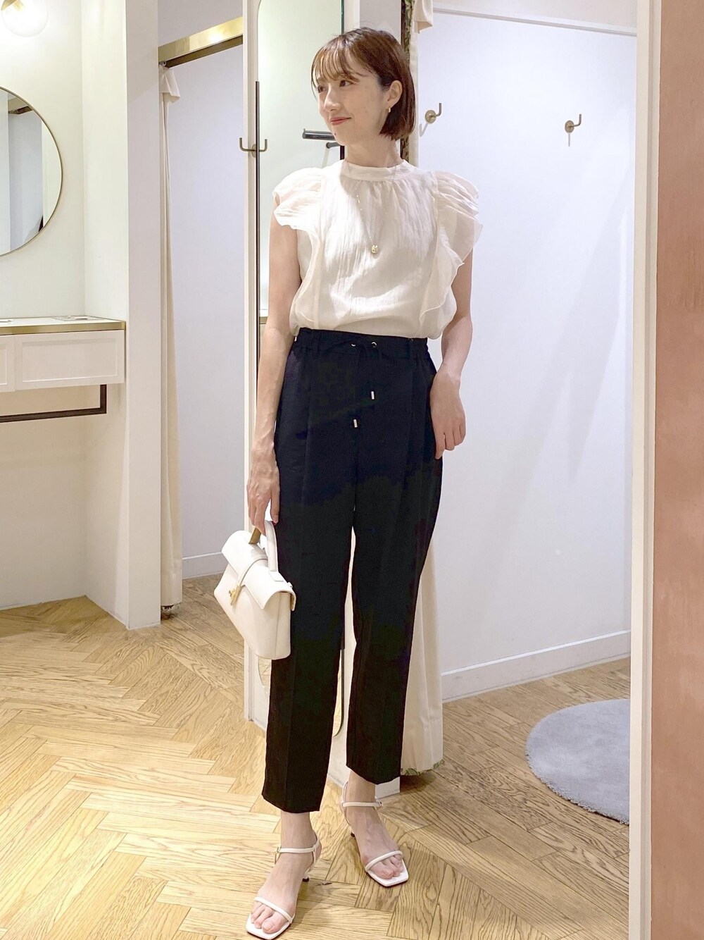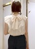 大人気のシャイニーボウタイブラウスの新色キナリを着てみました♪ ベージュよりも明るめで優しい雰囲気に! オフィスやセレモニーな場面でもオススメです◎