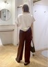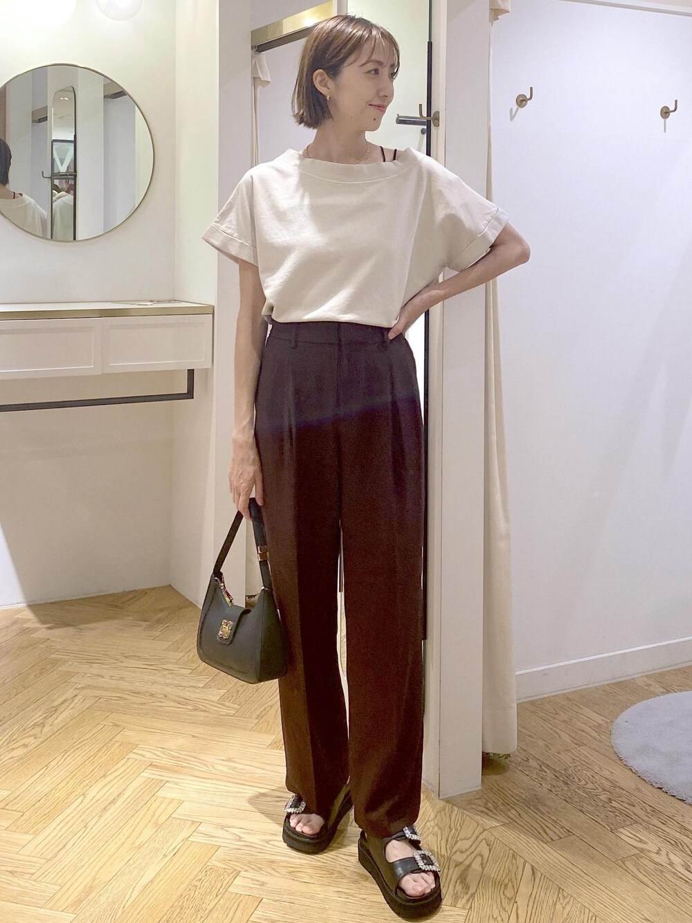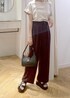 スウェット×ワイドパンツの大人カジュアルな楽ちんスタイリングです⭐︎ パンツにスウェット合わせだとラフになりがちなので、、、 片方だけ見せた肩紐と、前だけインして程よく力を抜いたのがポント!