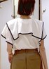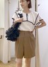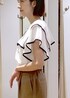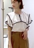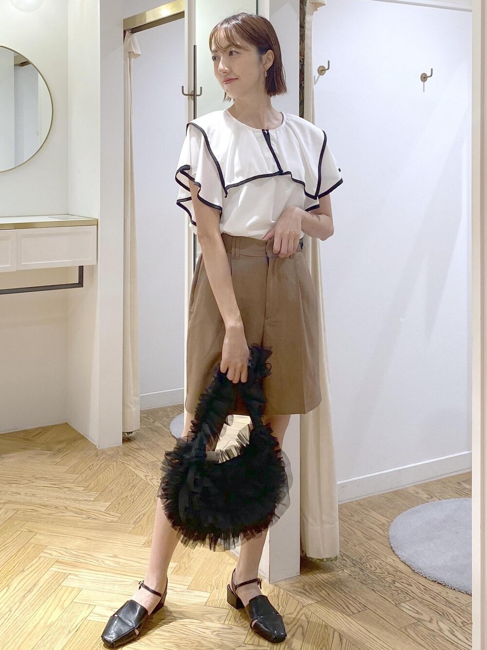 サラッとした着心地のラッフルブラウスが入荷しました! ショートパンツと合わせて大人カジュアルにコーディネート⭐︎ キレイめ×カジュアルなスタイルにしました!