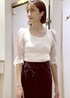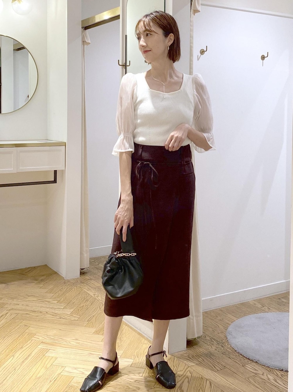 袖の長さがしっかりあるシアーニットなら、通勤着としてオフィスカジュアルにも使っていただけます◎ タイトスカートと合わせてキレイめスタイルにしました⭐︎